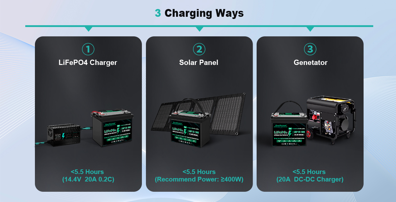Рекомендуется использовать зарядное устройство для литиевых аккумуляторов с током 10 А постоянного тока/20 А постоянного тока. Зарядному устройству для литиевых аккумуляторов 10 А требуется 10 часов для полной зарядки литиевого аккумулятора lifepo4 12 В 100 Ач, а зарядному устройству для литиевых аккумуляторов 20 А требуется 5 часов для полной зарядки аккумулятора 12 В 100 Ач. Максимальная поддержка зарядки 1С (100 А), полная зарядка менее чем за 1,5 часа, может соответствовать требованиям быстрой зарядки.