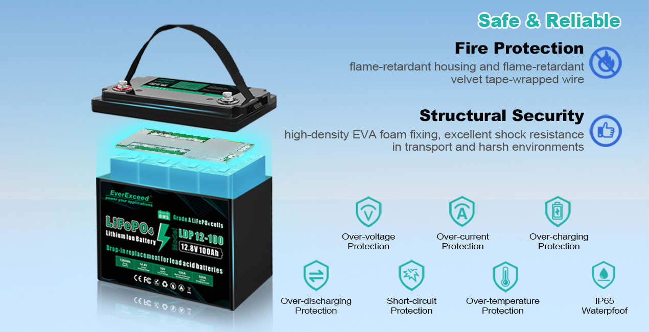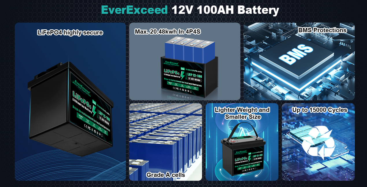 Сверхбезопасная батарея LiFePO4: размер литиевой батареи EverExceed Group 24 12 В 100 Ач составляет всего 10,24 x 6,69 x 8,35 дюйма, используются элементы LiFePO4 класса A+ с сертификатом UL для достижения более высокой плотности энергии, более стабильной производительности и превосходного качества, что гарантирует сверхбезопасность и надежность.