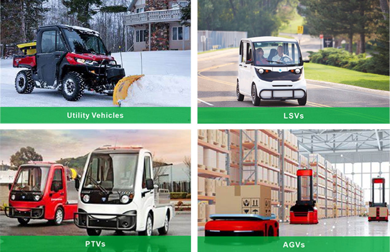 Гольф-кары, коммунальные транспортные средства, низкоскоростные транспортные средства (LSV), персональные транспортные средства (PTV), автоматически управляемые транспортные средства (AGV)