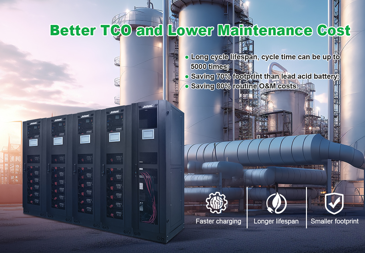 Снижение совокупной стоимости владения за счет до 5000 циклов, экономии пространства на 70% и снижения затрат на техническое обслуживание на 80% по сравнению со свинцово-кислотными аккумуляторами.