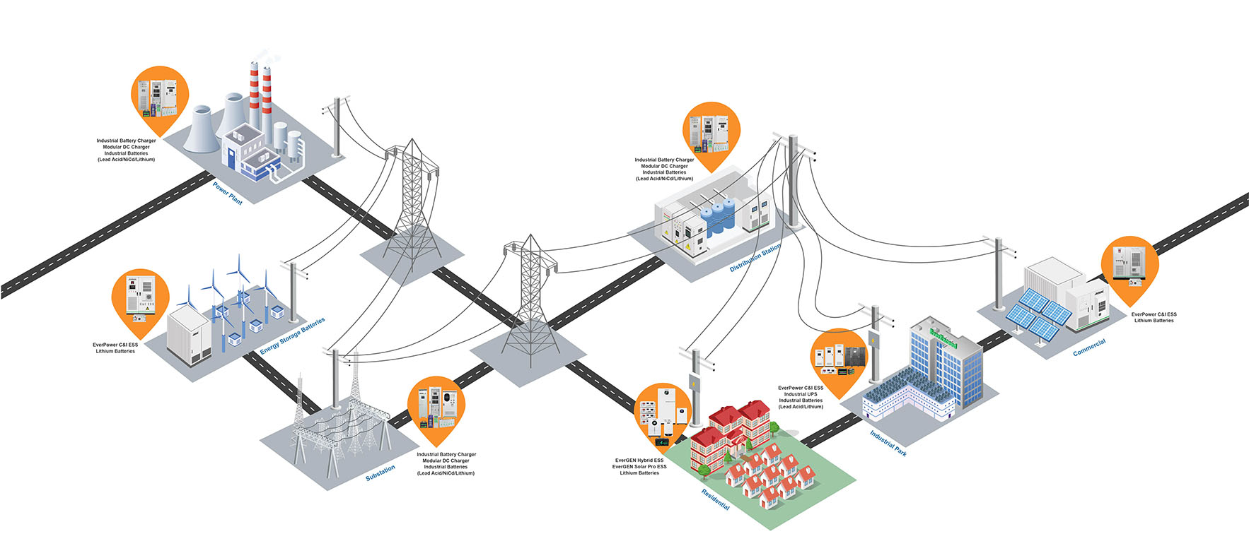 Компания EverExceed предоставляет масштабируемые системы постоянного тока, промышленные зарядные устройства и системы хранения энергии для поддержки подстанций, распределительных станций и узлов передачи высокого и среднего напряжения.