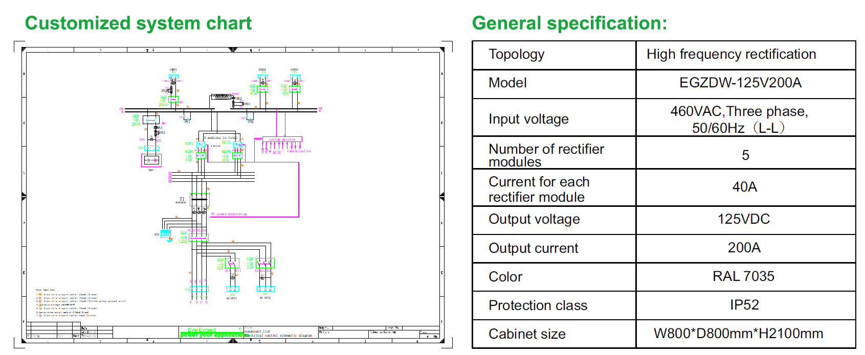 Компания EverExceed разработала модульное зарядное устройство постоянного тока с высокочастотным выпрямителем 125 В постоянного тока и напряжением 200 А в соответствии с требованиями заказчика. Операционная система состоит из пяти высокочастотных выпрямительных модулей и оснащена модулем мониторинга и защитой от грозовых перенапряжений. Выходная нагрузка оснащена настраиваемой понижающей кремниевой цепью (макс. понижающее напряжение 35 В, 50 А). Кроме того, шкаф LP52 оснащен такими функциями, как температурная компенсация, тестирование разряда аккумулятора и защита от замыкания на землю. Это специализированное зарядное устройство постоянного тока обладает улучшенными функциями мониторинга и защиты, не только удовлетворяя потребности в питании специального оборудования на подстанции, но и отслеживая рабочее состояние, своевременно уведомляя дежурный персонал о любых предупреждениях о неисправностях и обеспечивая нормальную работу оборудования на подстанции.