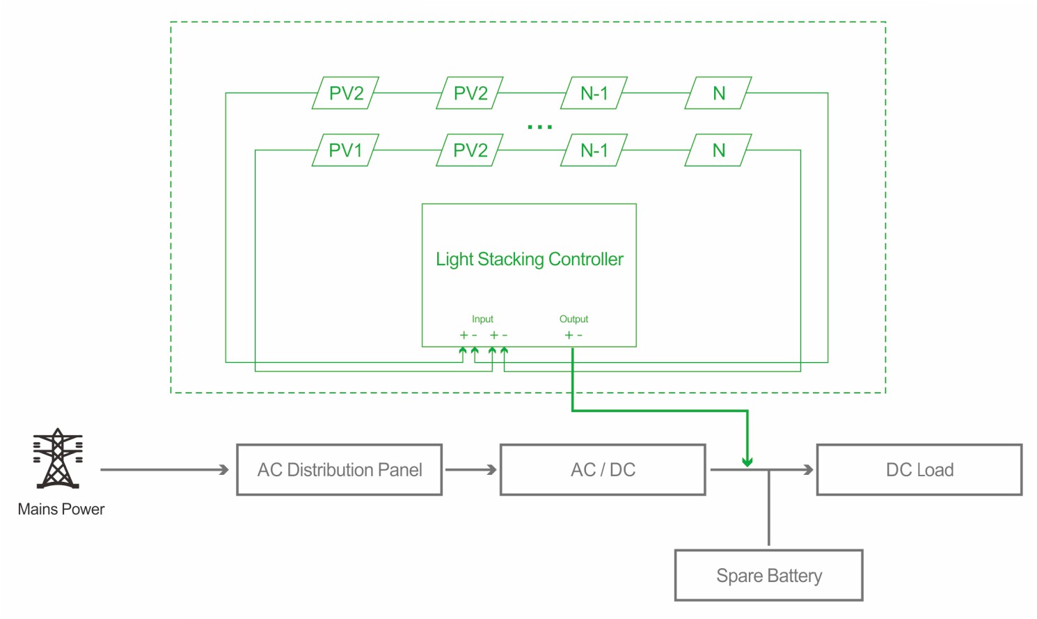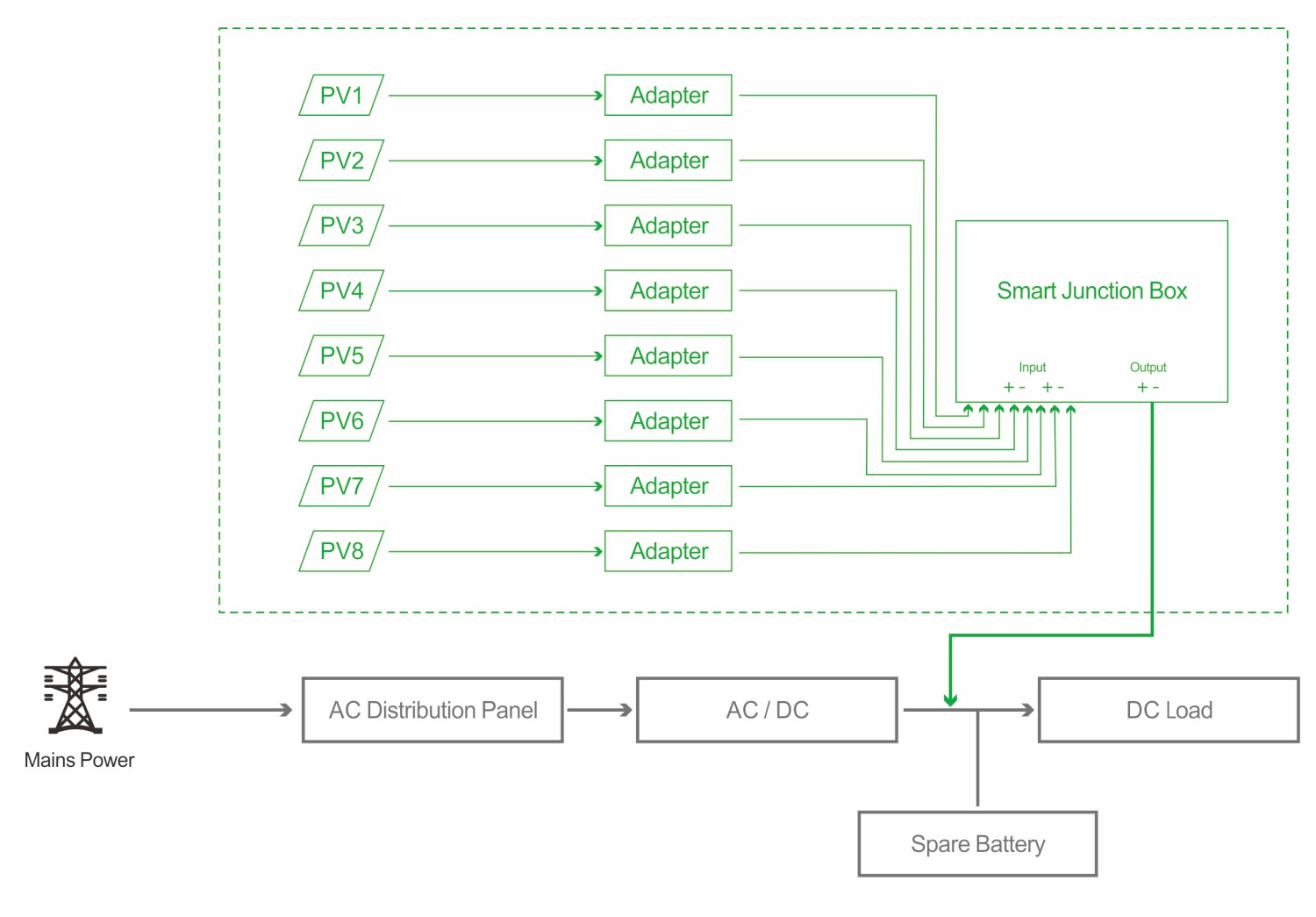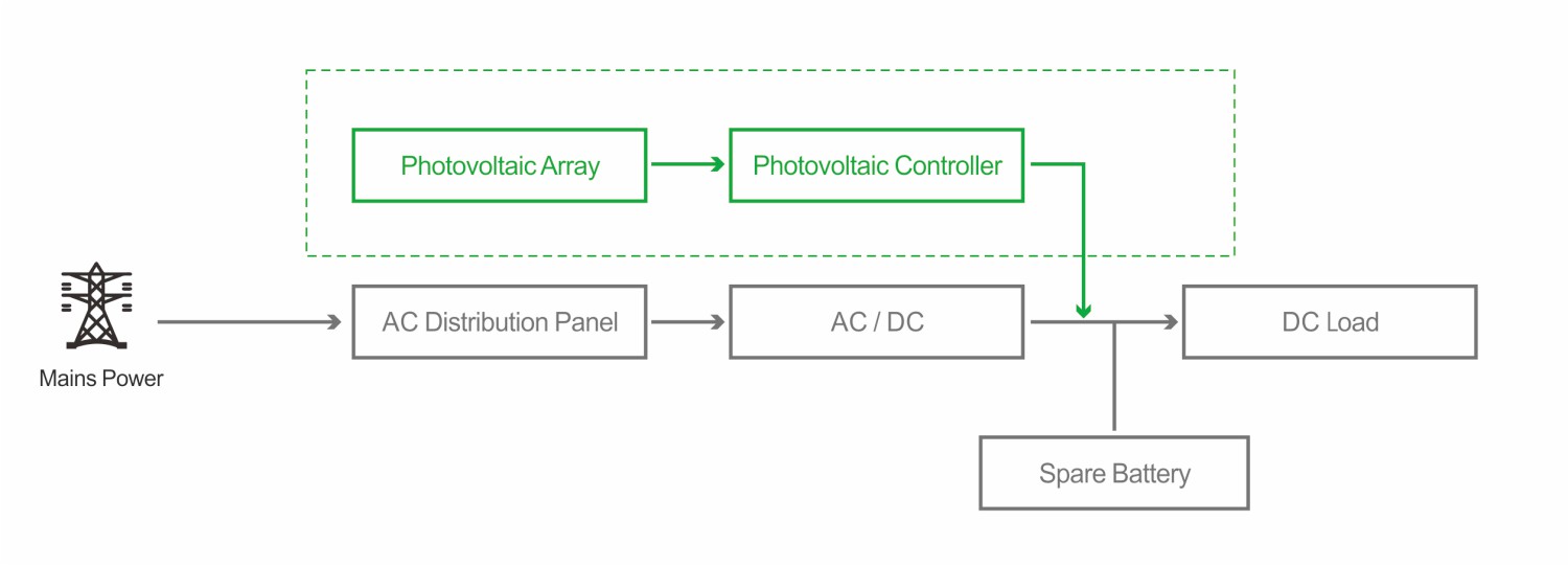 PV-Overlay интегрирует дополнительную фотоэлектрическую систему в существующую архитектуру электропитания базовой станции телекоммуникаций, обеспечивая гибридное энергоснабжение «PV + Utility Grid».